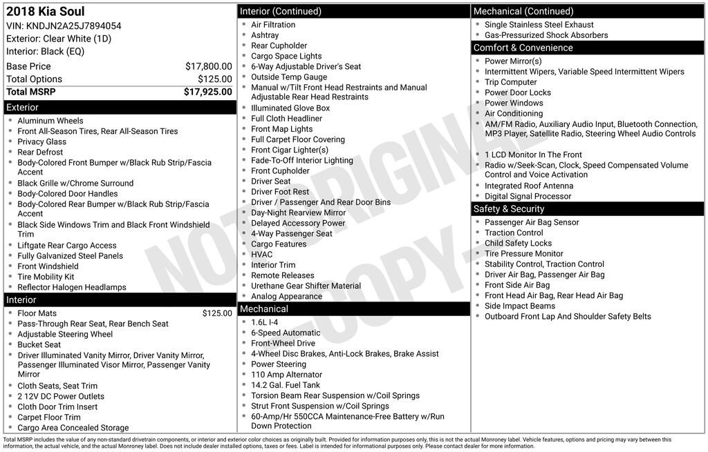 Our Clear White **Accident Free**2018**Kia**Soul**Wagon**Cloth Seats** is ready for your lifestyle. Powered by a 1.6 Liter 4 Cylinder offers 130hp connected to an electronically-controlled 6 Speed Automatic transmission. This Front Wheel Drive wagon shows off nearly 30mpg on the road along with sporty 16-inch alloy wheels, multi-reflector headlights, and privacy glass.