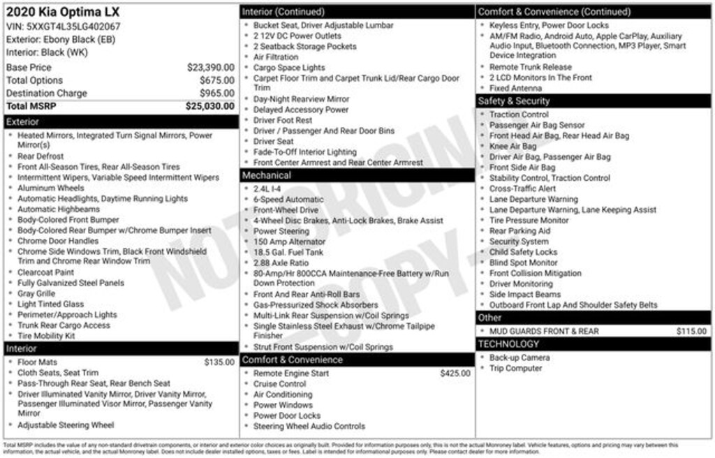 Sleekly designed, our Accident Free, One Owner 2020 Kia Optima LX Sedan can take you in a bolder direction in Ebony Black! Powered by a 2.4 Liter 4 Cylinder offering 185hp tethered to a 6 Speed Sportmatic Automatic transmission for confident performance. Able to see nearly 34mpg on the highway, this Front Wheel Drive sedan also rewards you with excellent dynamics and aggressive good looks. A tiger-nose grille leads the way for signature Kia style and is complemented by LED lighting, heated mirrors, and stylish 16-inch alloy wheels.
