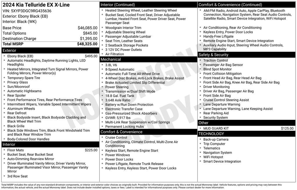 Our **2024**Kia**Telluride**EX X-Line**AWD**Navigation**Sunroof** is here to dominate family drive time in Ebony Black! Powered by a 3.8 Liter V6 offering 291hp to an 8 Speed Automatic transmission with Drive Mode Select. This All Wheel Drive SUV also hustles you over challenging terrain with a center-locking differential and self-leveling rear suspension, and it scores nearly 24mpg on the highway. Aggressive and impressive, our Telluride travels in style with LED lighting, a power sunroof, 20-inch gloss-black wheels, high-utility roof rails, a hands-free liftgate, and exciting X-Line details.