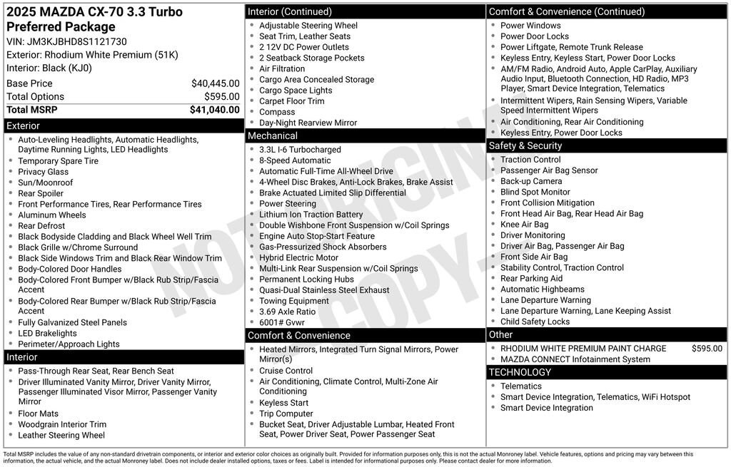 Our **2025**Mazda**CX-70**Turbo Preferred**AWD**Heated Leather Seats**Sunroof** raises the bar for refined adventures in Rhodium White Metallic! Powered by a TurboCharged 3.3 Liter 6 Cylinder and an Electric Motor delivering a combined 280hp to an 8 Speed Automatic transmission that's ready for action with Off-Road and Sport modes. This All Wheel Drive SUV also features a sporty suspension for enthusiastic handling, and it returns nearly 28mpg on the highway. Aerodynamically engineered, our Mazda CX-70 captures attention with LED lighting, a power sunroof, a power liftgate, heated power mirrors, black accents, roof rails, and bold wheels.Room for five leaves plenty of versatile cargo space in the rear of our Turbo Preferred cabin, which has heated leather power front seats, a folding second row, a leather-wrapped steering wheel, tri-zone automatic climate control, and keyless access/ignition. A 12.3-inch touchscreen and a 7-inch driver display highlight the dash to support wireless Apple CarPlay®/Android Auto®, Bluetooth®, voice control, and an eight-speaker audio system.You can travel with sure-footed safety, knowing Mazda supplies adaptive cruise control, automatic emergency braking, blind-spot monitoring, a rearview camera, lane-keeping assistance, a driver attention monitor, parking sensors, and other intelligent technologies. An elevated ownership experience awaits in our Mazda CX-70 Turbo Preferred! Save this Page and Call for Availability. We Know You Will Enjoy Your Test Drive Towards Ownership! We offer PRE-APPROVAL programs so call (515) 256-4010 to get started today! At Gregg Young Chevrolet... We'll Go The Extra Mile For You. We have an app for that! Download the Gregg Young Chevrolet application directly to your iPhone or Android.