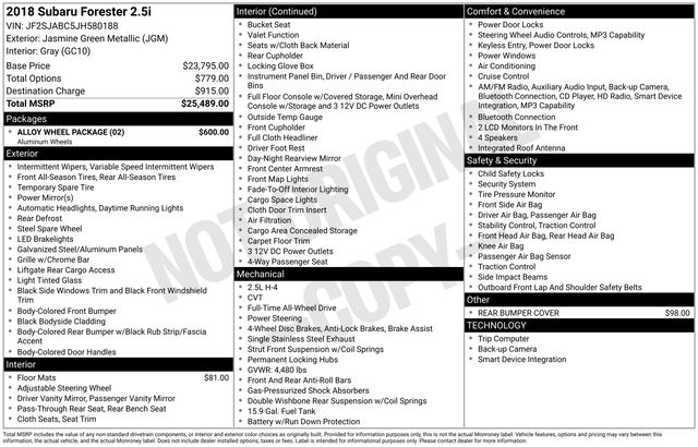 Our rugged **2018**Subaru**Forester**2.5i**AWD**Cloth Seats**Rear Camera** in Jasmine Green Metallic has been carefully designed with the features that are most important to you! Powered by a 2.5 Liter BOXER 4 Cylinder that offers 170hp connected to a CVT for efficient performance. This All Wheel Drive SUV rewards you with nearly 32mpg on the road plus, with 8.7 inches of ground clearance, our Forester serves up a comfortable and capable ride even when road conditions are less than ideal. Functional and stylish, the brilliant design of this Forester 2.5i helps you love every day's journey.