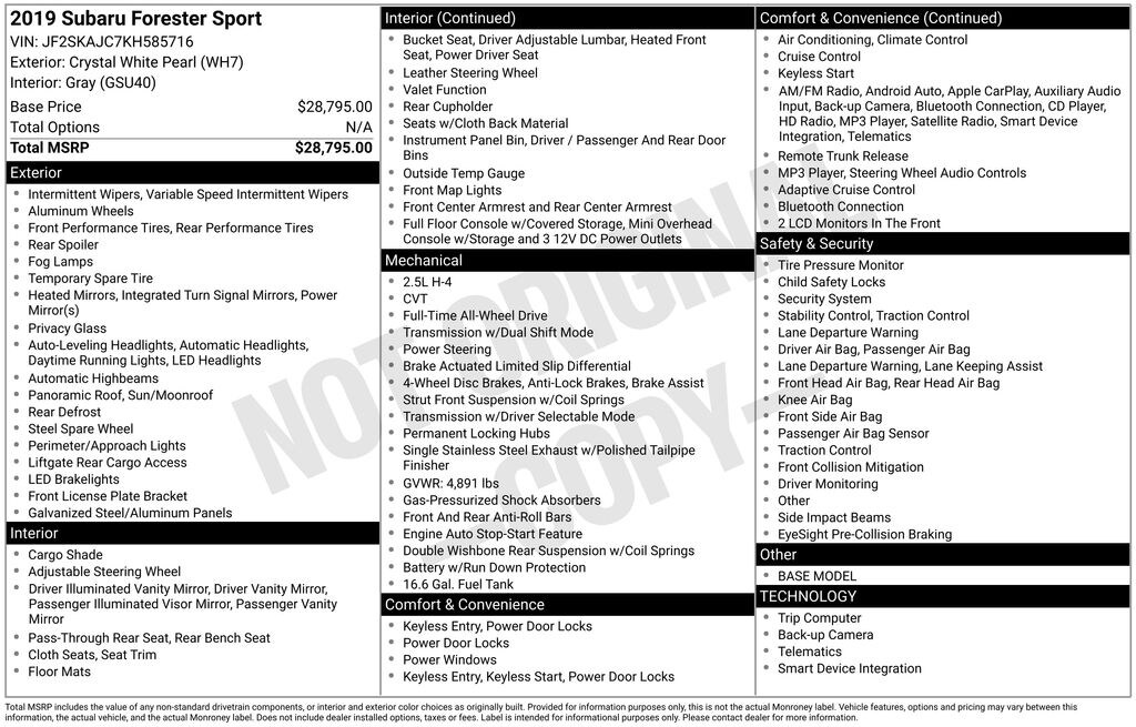 Our captivating and capable Accident Free 2019 Subaru Forester Sport AWD in Crystal White Pearl has been carefully engineered with a love for adventure! Powered by a 2.5 Liter BOXER 4 Cylinder that offers 182hp paired to a paddle-shifted CVT with a 7 Speed Manual setting for enthusiasts! This All Wheel Drive SUV also features an X-Mode for trickier terrain, a Sport Sharp Mode for enhanced performance, and the ability to see nearly 33mpg on the highway. That makes our Forester a joy to drive almost everywhere. Plus, it stands out with LED lighting, fog lamps, a sport-style front bumper, a panoramic sunroof, and athletic details that include 18-inch black alloy wheels.