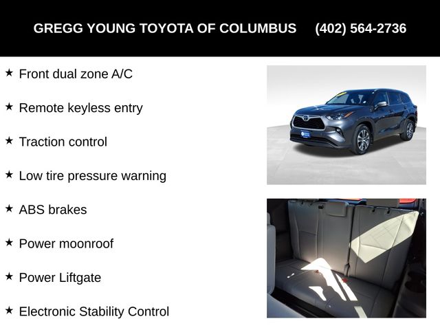Toyota provides high-tech passenger protection with automatic braking, lane-keeping assistance, a rearview camera, blind-spot monitoring, adaptive cruise control, and more to help keep your family safe. Now take off in our Highlander XLE for trail-blazing good times! Save this Page and Call for Availability. We Know You Will Enjoy Your Gregg Young Toyota of Columbus Test Drive Towards Ownership!